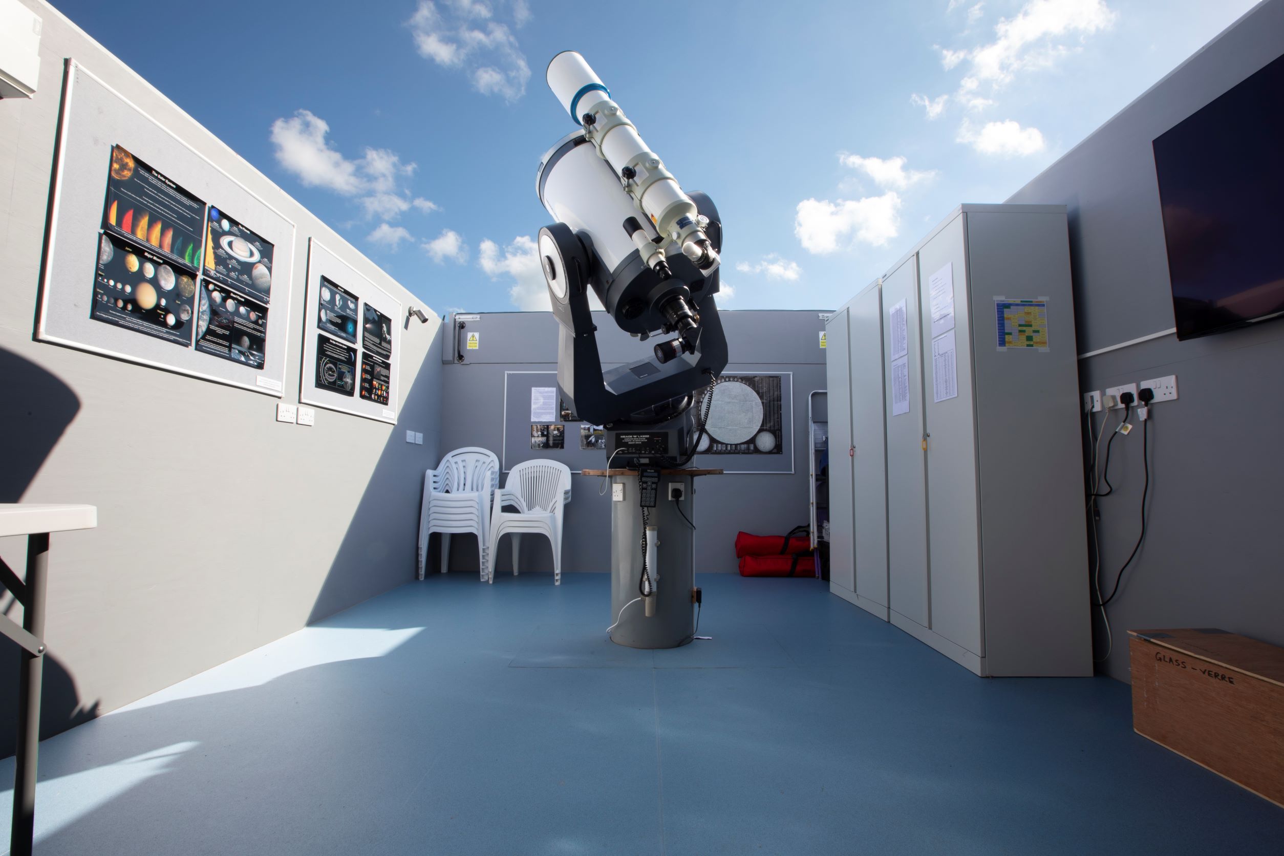 - Main Observatory: A timber-framed building with a roll-off roof housing a 16-inch research-grade Meade reflecting telescope and a 5-inch Takahashi refractor on a computer-controlled equatorial mount; and a 55-inch wall mounted monitor for presentations.